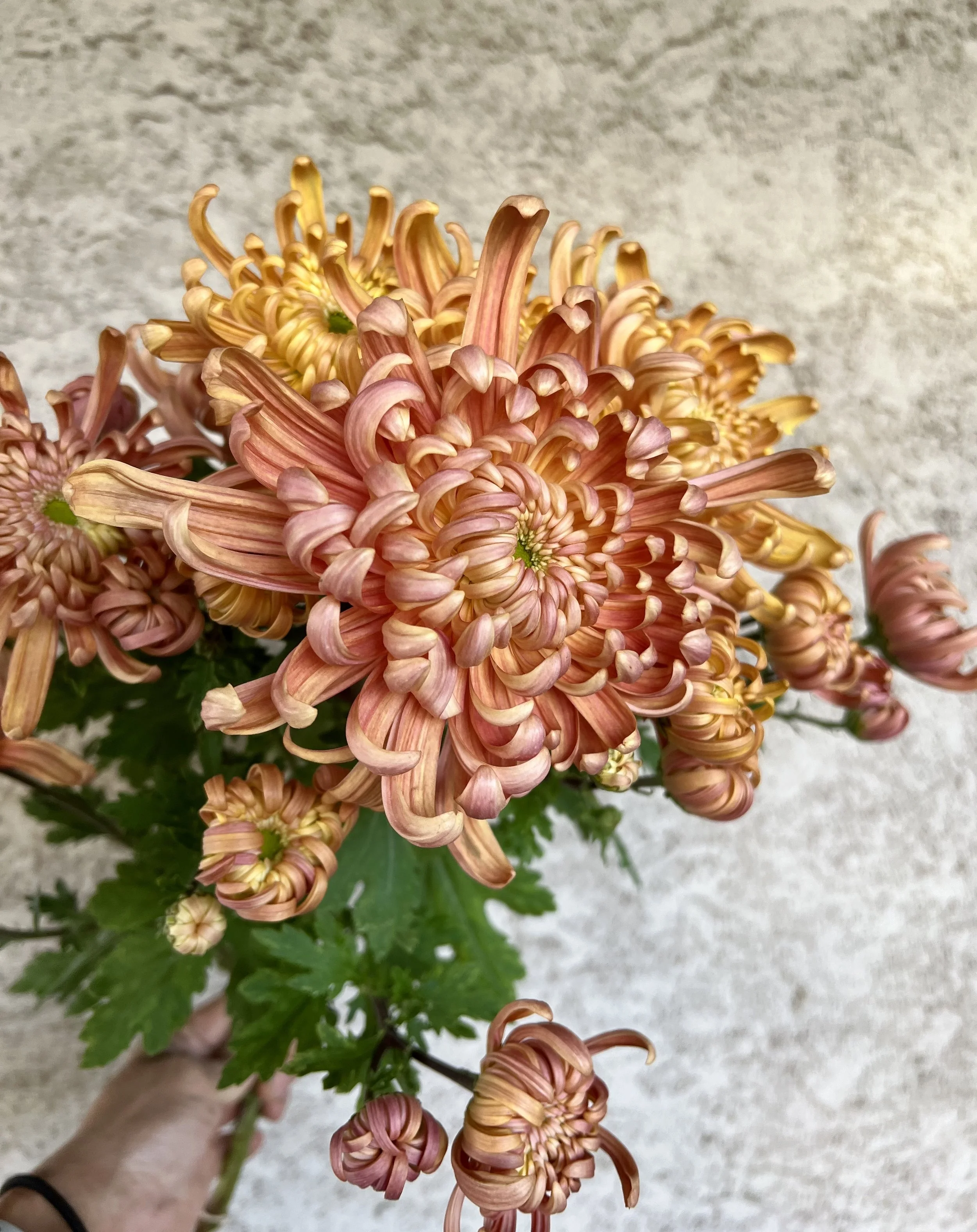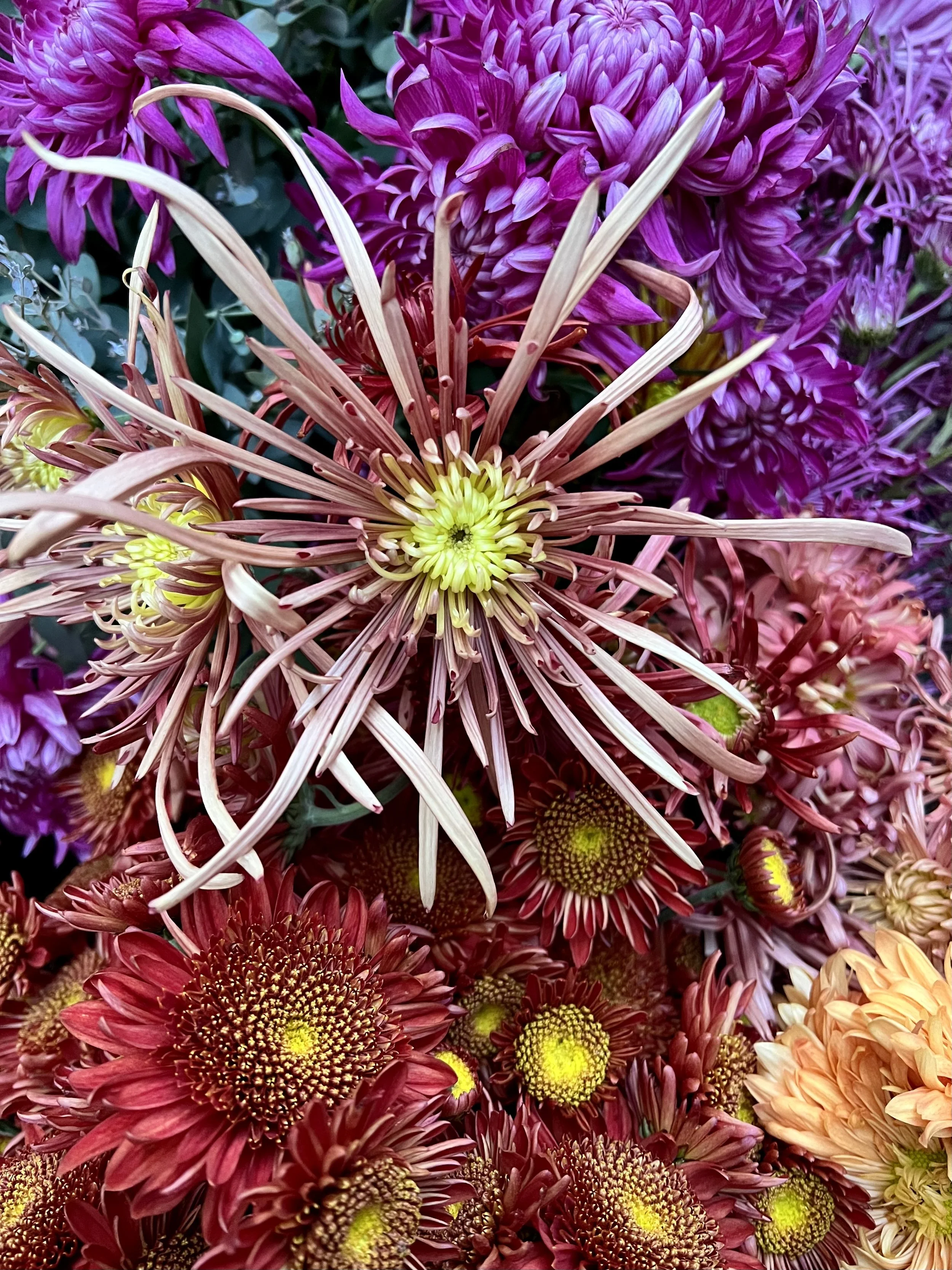 Though chrysanthemum plants are more hardy than dahlias, the blooms need protection from frost, ideally a high tunnel or hoop house, or they are likely to sustain damage with frost or light freezes. In climates like mine (zone 6b, eastern PA), protected conditions increase the likelihood of reaching successful harvest. If attempting to grow without a high tunnel in similar zones, it is important to pay attention to bloom time when selecting varieties. For example, choose “early” varieties that will initiate bloom September to early October. Mature height is also an important consideration as many cultivars will grow too tall for a low tunnel. The mums I naturally gravitate towards are later to flower, hitting peak bloom time mid to late October into mid November.